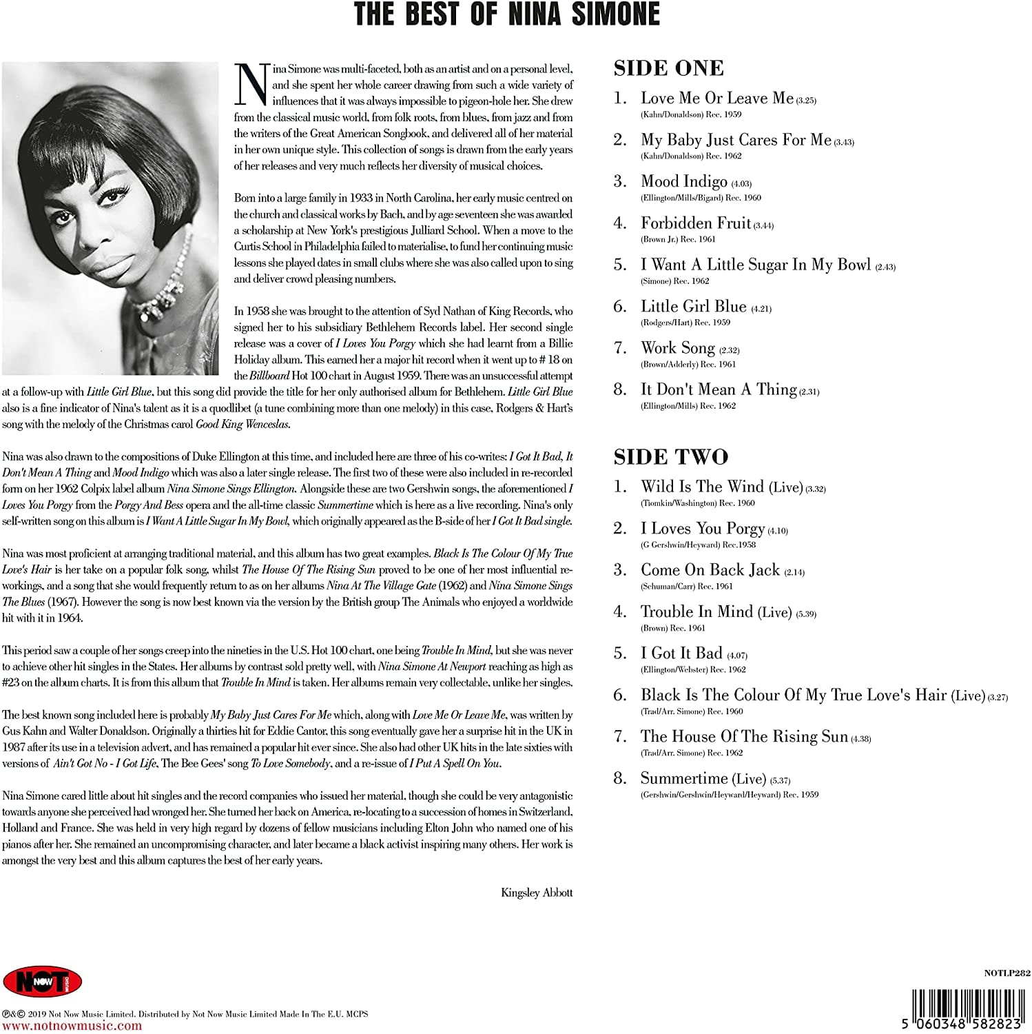 Nina Simone was multi-faceted, both as an artist and on a personal level, and she spent her whole career drawing from such a wide variety of influences that it was always impossible to pigeon-hole her. She drew from the classical music world, from folk roots, from blues, from jazz and from the writers of the Great American Songbook, and delivered all of her material in her own unique style. This collection of songs is drawn from the early years of her releases and very much reflects her diversity of musical choices. Her work is amongst the very best and this album is a taster of her immense talent.