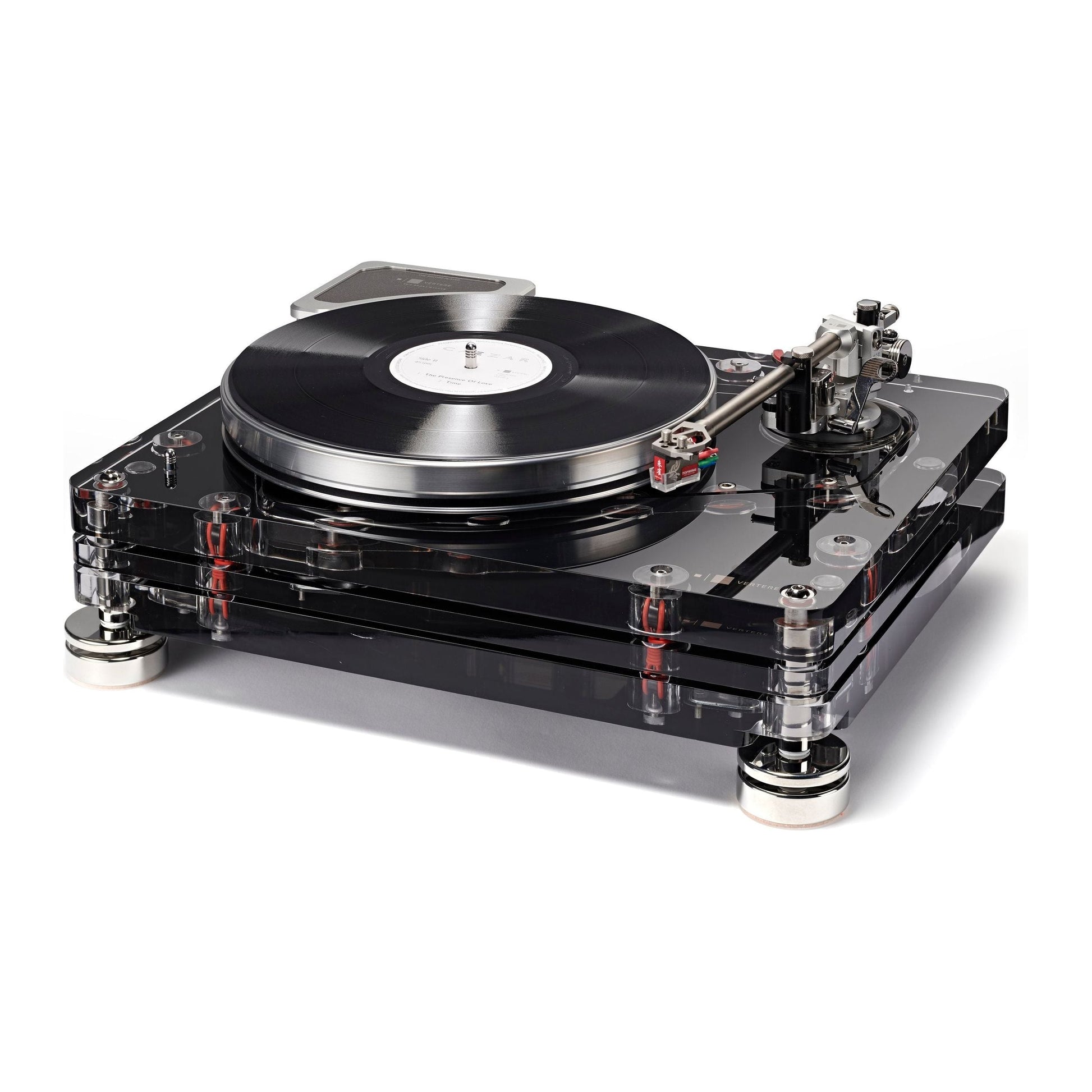 On the main structure of the record player, the drive engine is a Swiss-made synchronous motor. Vertere’s unique self-synchronising system for the motor keeps belt tension constant and also keeps any residual noise away from the platter. An external dedicated motor drive power supply unit, precisely tuned to each individual motor, ensures optimum power to the motor while keeping motor noise to a minimum.